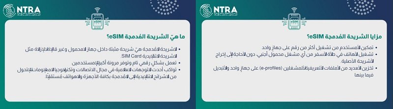 وتعد الشريحة المدمجة eSIM بديل متطور عن شرائح المحمول التقليدية حيث تتيح للمستخدمين إمكانية التبديل بين شركات الاتصالات بسهولة ودون الحاجة إلى شريحة فعلية.